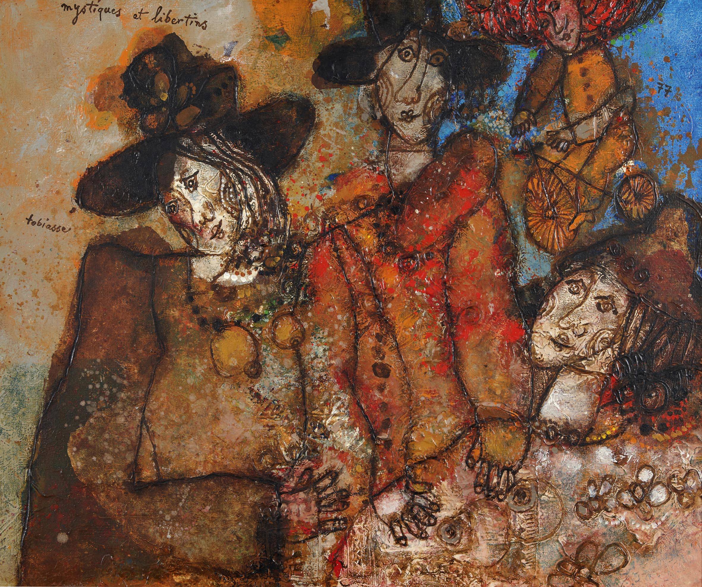 Théo Tobiasse entstammte einer litauisch-jüdischen Immigrantenfamilie, die aus wirtschaftlichen Gründen 1931 nach Paris zog. Hier absolvierte Tobiasse eine Ausbildung an der École des Arts Décoratifs, die durch den Ausbruch des Zweiten Weltkrieges unterbrochen wurde. Die Familie lebte während über zwei Jahren versteckt in der französischen Metropole, ohne die kleine Wohnung je zu verlassen oder sie auch nur zu erhellen. Man verbrachte die Zeit mit Lesen, Zeichnen und Schachspiel, und Tobiasse baute sich einen riesigen Fundus an Zeichnungen auf, aus dem er später schöpfen konnte. Nach Kriegsende arbeitete er während 15 Jahren als grafischer Gestalter für die Firma Hermès in Paris und Nizza. Daneben malte er, meist nachts. Nach einem ersten erfolgreichen Ausstellungsauftritt in Nizza entschied er sich für eine Laufbahn als freischaffender Künstler. Mit seinem von der Nouvelle École de Paris inspirierten Werk fand er rasch internationale Anerkennung und gewann Auszeichnungen wie etwa 1961 den Dorothy Gould-Preis. 1976 verlegte er sein Atelier nach Saint-Paul-de-Vence, und ab 1980 reiste er regelmässig nach New York, wo er sich jährlich für mehrere Monate aufhielt. Dabei war er seinen Freunden und Förderern, den Kunsthändlern Kenneth und Sherri Nahan, nahe. Die Gemälde und Druckgrafiken von Théo Tobiasse enthalten, vergleichbar mit jenen von Marc Chagall, oft Themen aus der jüdischen Kultur, bergen Anspielungen auf biblische Inhalte und verarbeiten erotische Fantasien sowie Themen der Einsamkeit und Isolation. Der oft inhaltsschweren Thematik seiner Werke stellte der Künstler eine tänzerische, fliessende Formensprache und eine bunte Farbigkeit entgegen.