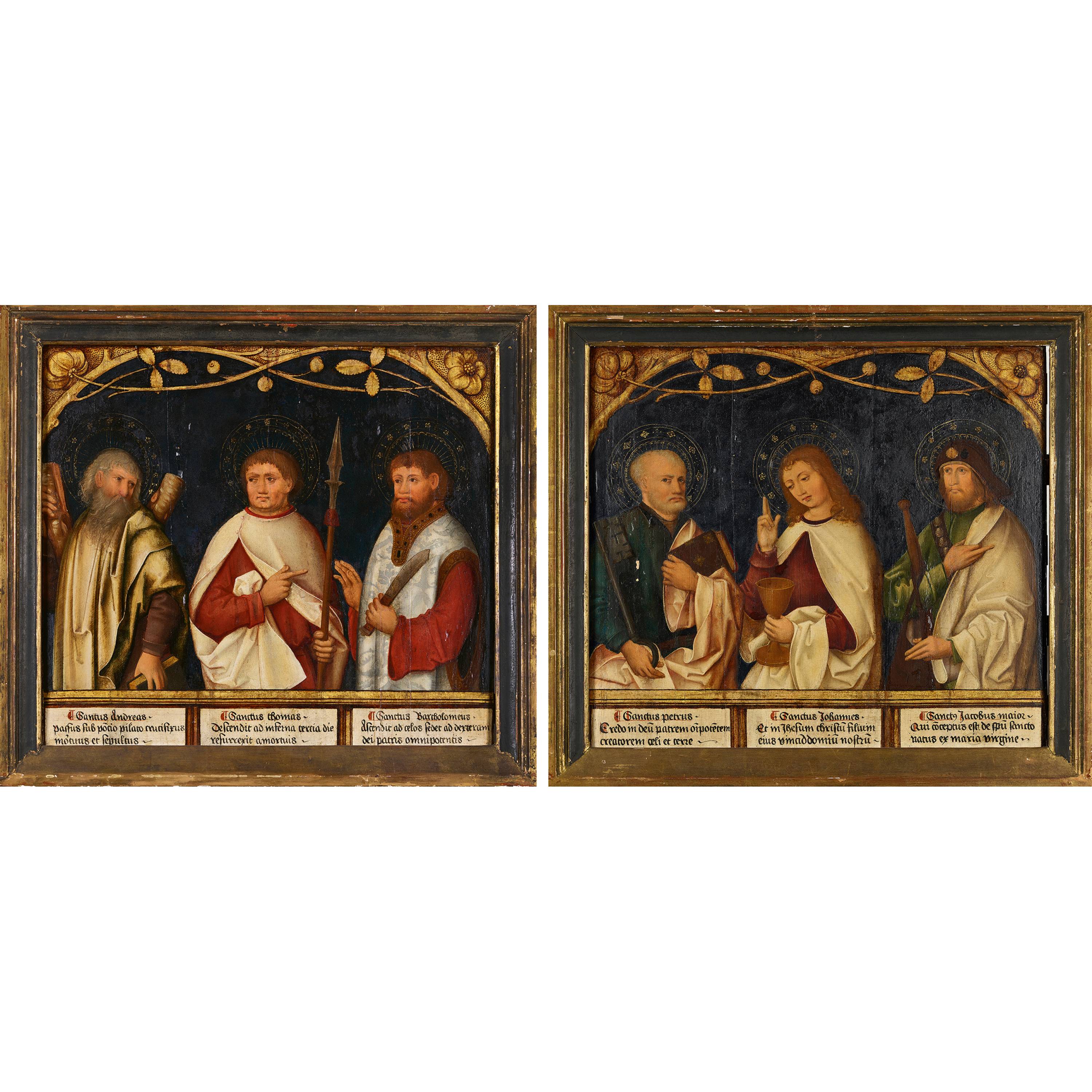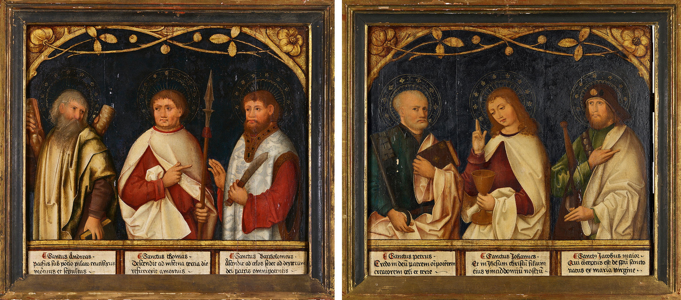 Bei den angebotenen Tafeln handelt es sich um zwei der ursprünglich aus vier Tafeln zusammengefügten Predella mit der Darstellung der zwölf Apostel. Auf den beiden vorliegenden Tafeln sind die Apostel Petrus, Johannes Evangelist und Jacobus der Ältere bzw. Andreas, Thomas und Bartholomäus dargestellt. Ludwig Meyer verweist in seinem Gutachten darauf, dass die Tafeln der Schule von Hans Holbein dem Älteren in Augsburg zuzurechnen sind, was sich vor allem an den feinen und transparenten Nimben der Apostel und dem bekrönenden goldenen Astwerk erkennen lässt. Eine dritte zugehörige Tafel ist seit 1914 Bestandteil des Musée de Grenoble (siehe Marcel Destot, Peintures des écoles du Nord. La collection du musée de Grenoble, Paris 1994, S. 213, mit Abbildung), während die vierte Tafel als verschollen gilt.