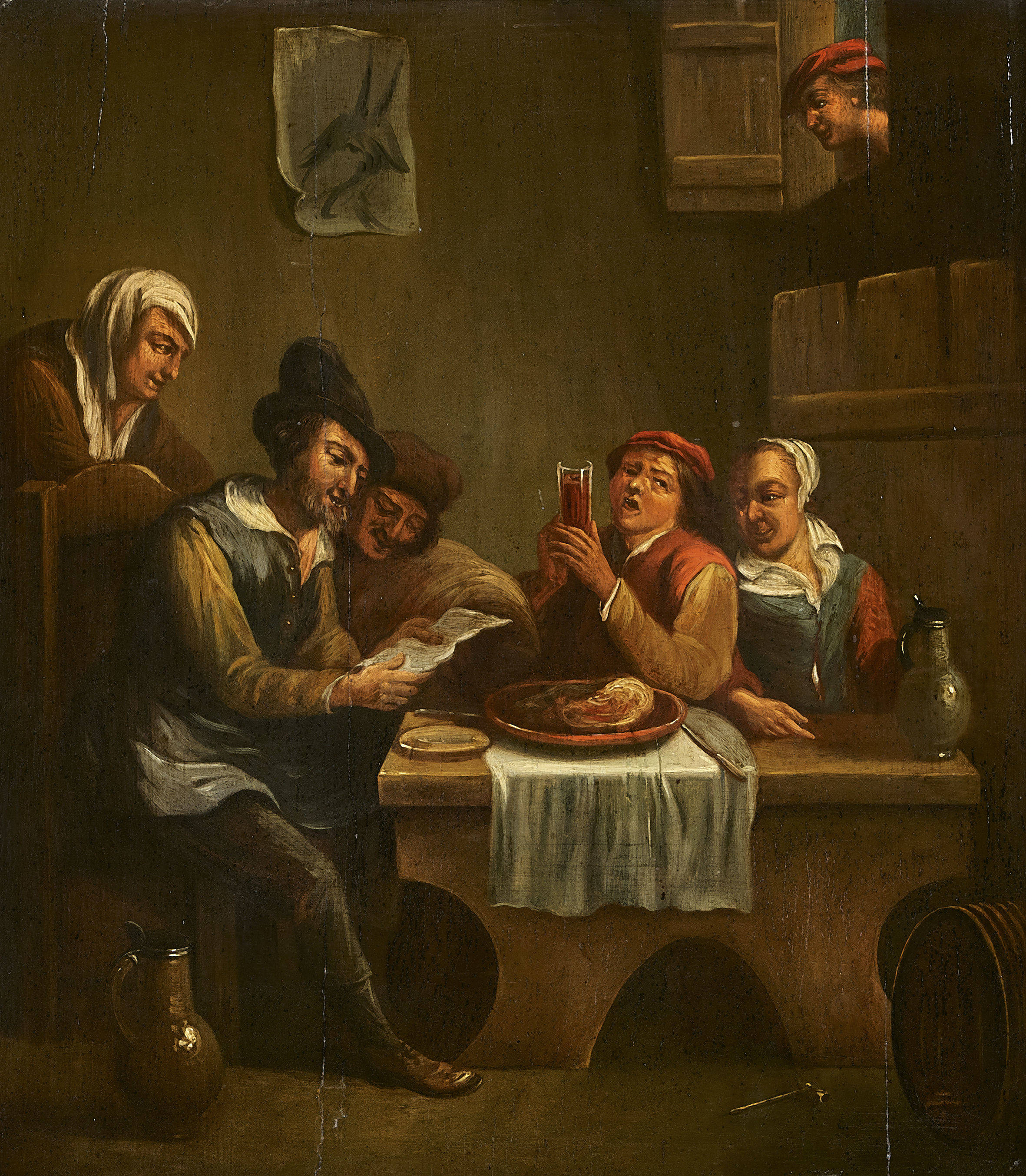 Das angebotene Werk ist die malerisch umgesetzte Kopie einer druckgrafischen Arbeit von 1734, die ihrerseits - in spiegelbildlicher Wiedergabe - auf ein Gemälde von David II Teniers zurückgeht.