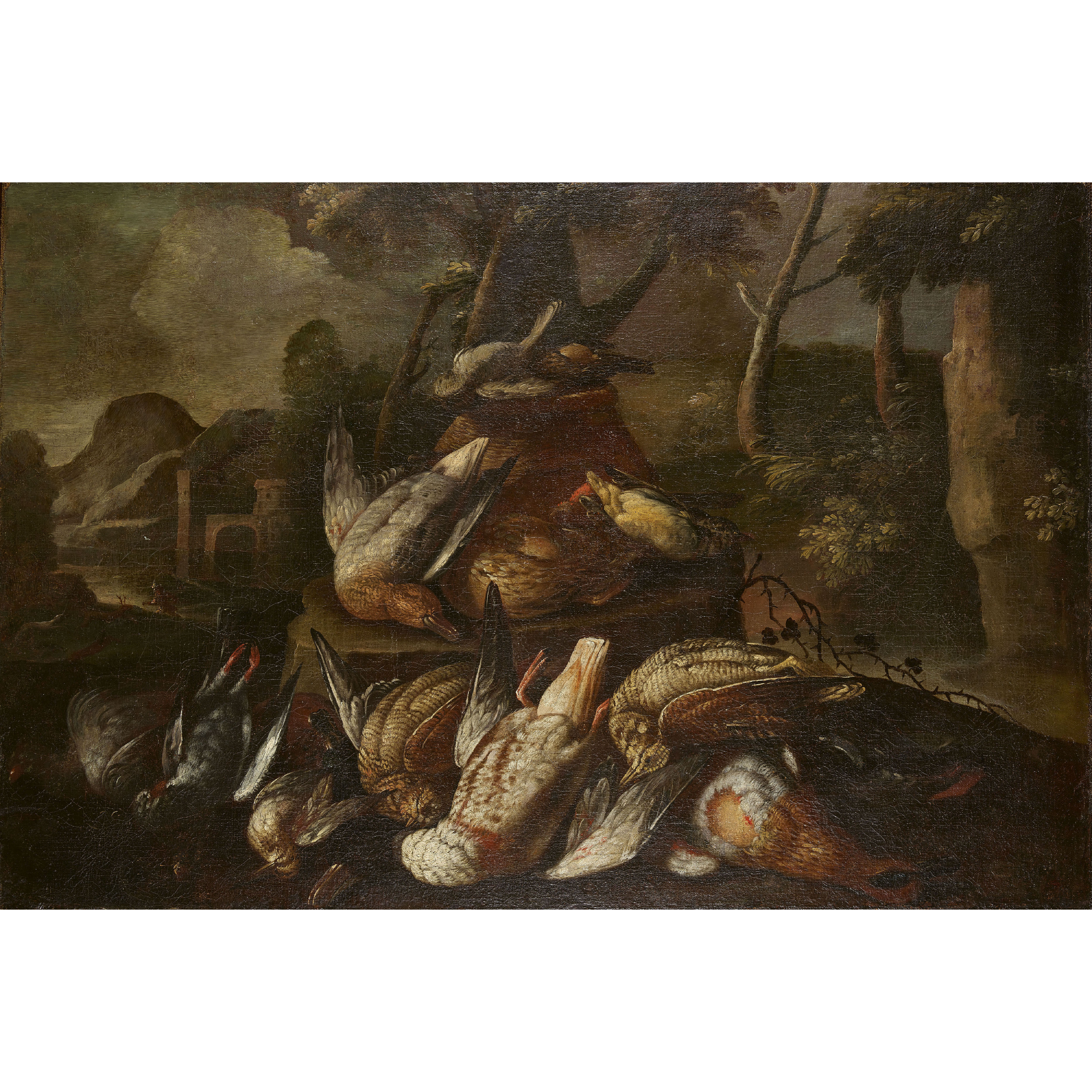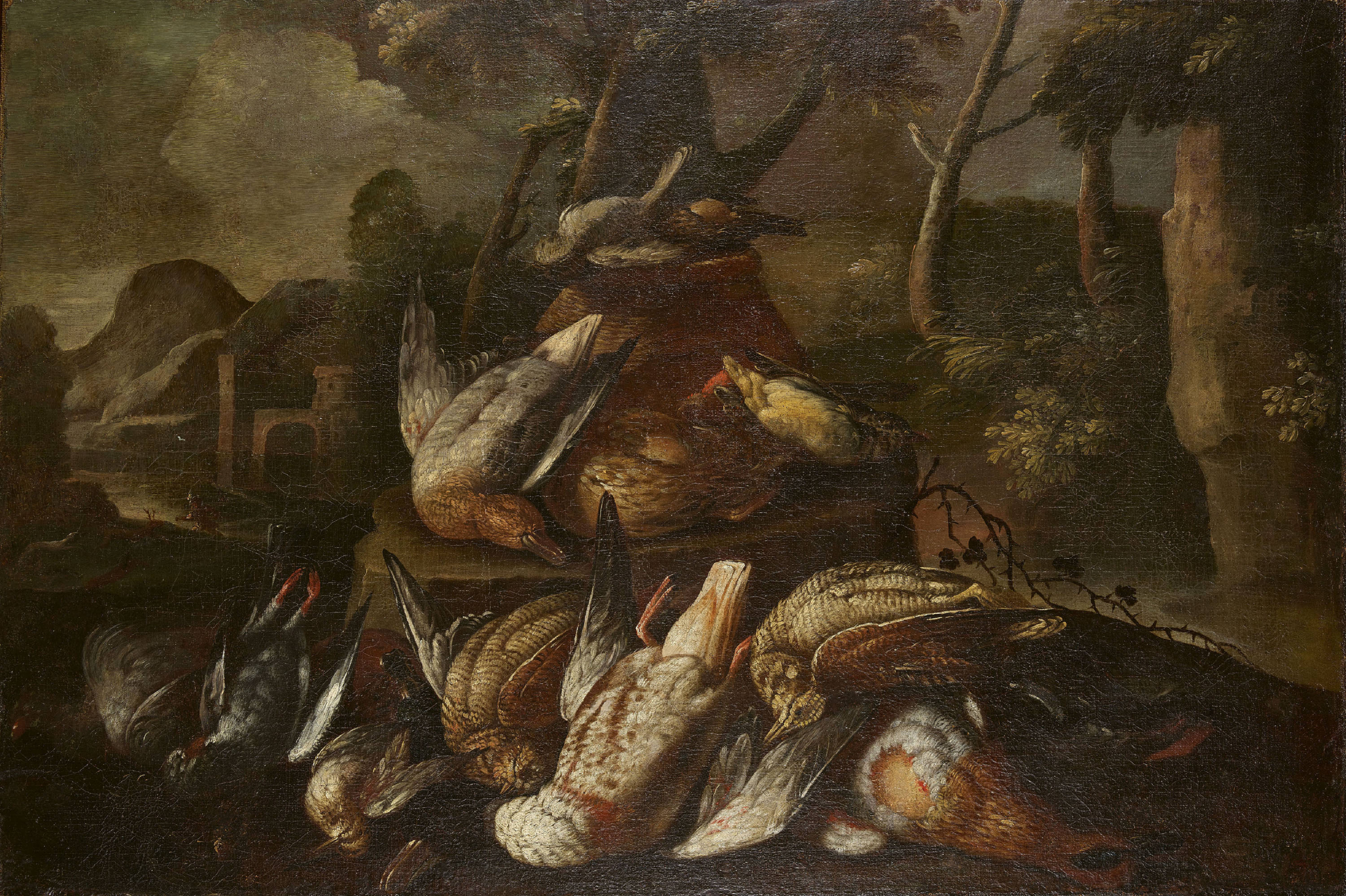 Stillleben mit erlegtem Federvieh vor Landschaft.
