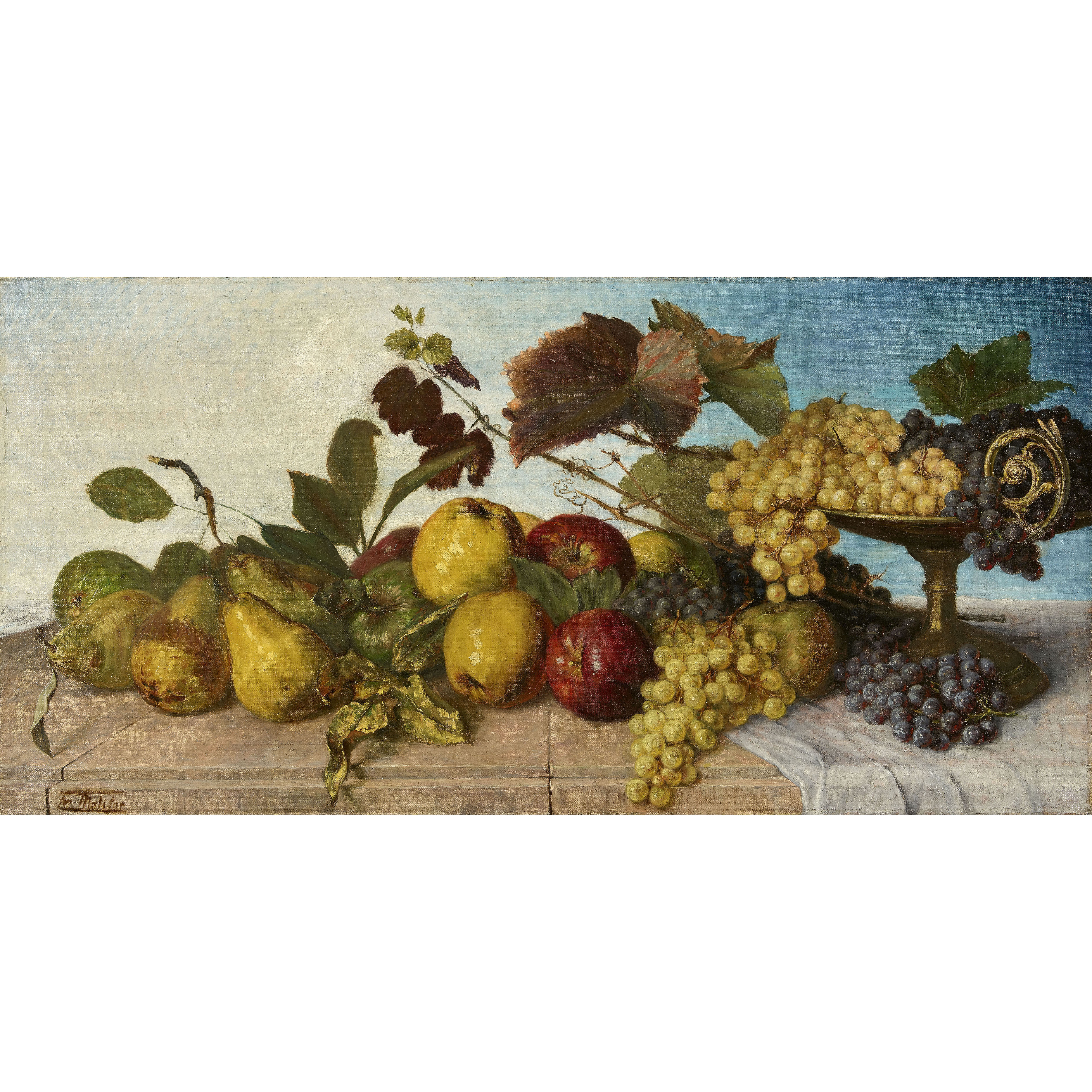 Stillleben mit Birnen, Äpfeln und Trauben.