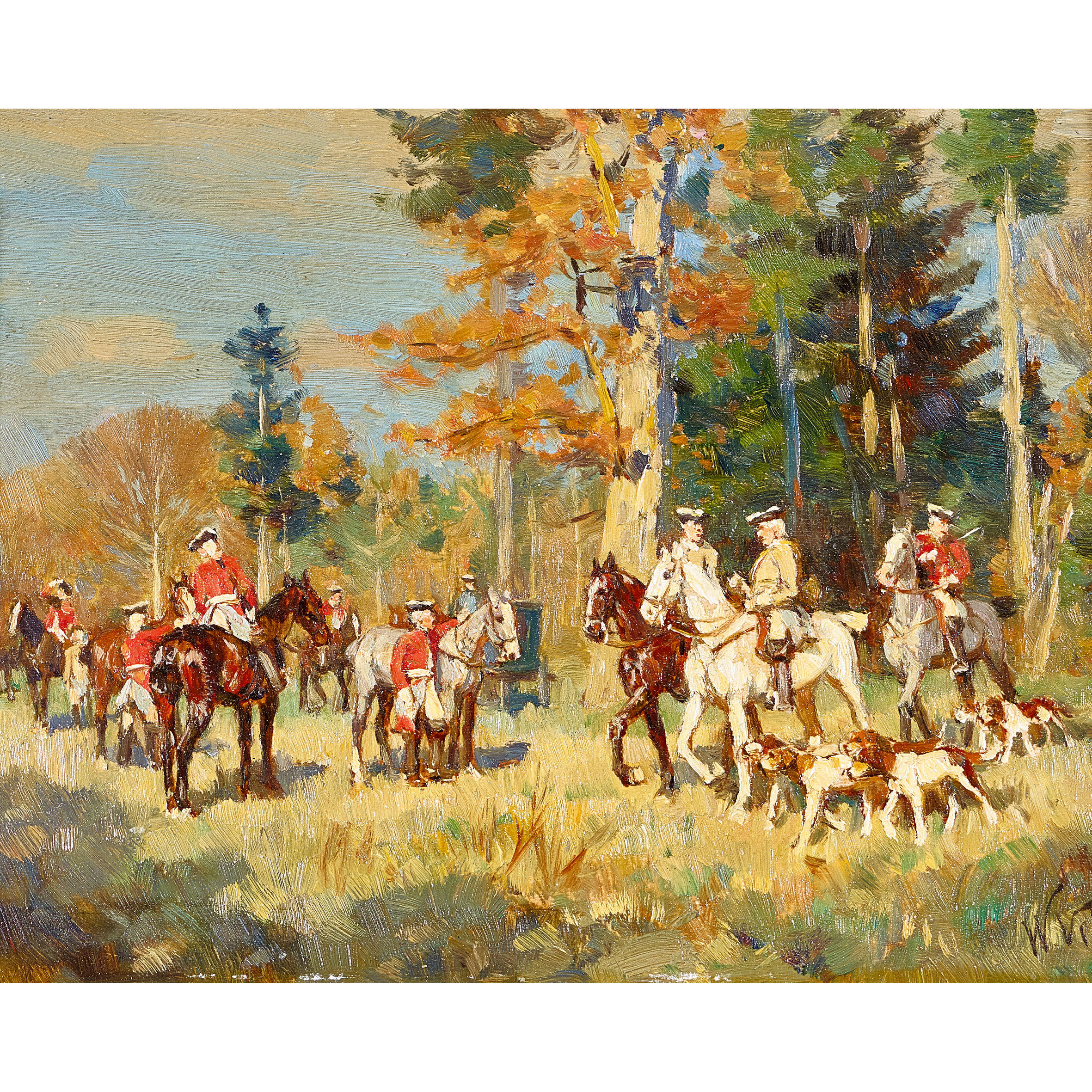 Jagdgesellschaft am Waldrand.