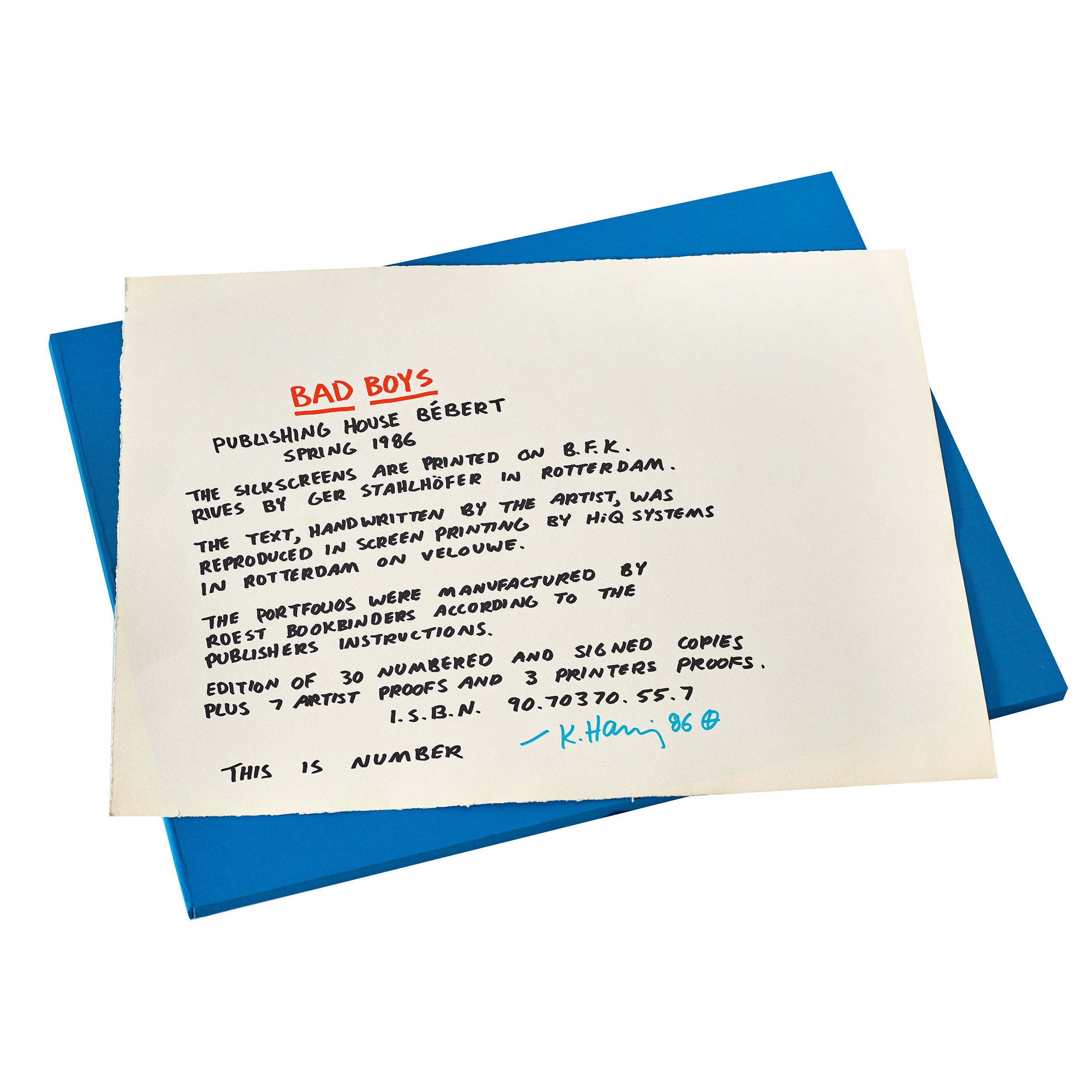 Bébert, Rotterdam 1986. 1 von 3 "Printers Proof"-Exemplaren (Gesamtauflange 40 Exemplare). Druckvermerk, Titelblatt (je zweifarbig schwarz und orange) und Deckblatt (orange) sowie 6 schwarz-weisse Siebdrucke auf BFK Rives-Papier. Siebdrucke je handsig., dat. (19)86 u. bez. "TP", je 51x66 cm. Druckvermerk von Keith Haring mit blauem Filzstift handsig. u. dat. (19)86. Blaue Leinenkassette, Quer-Gr.-Folio