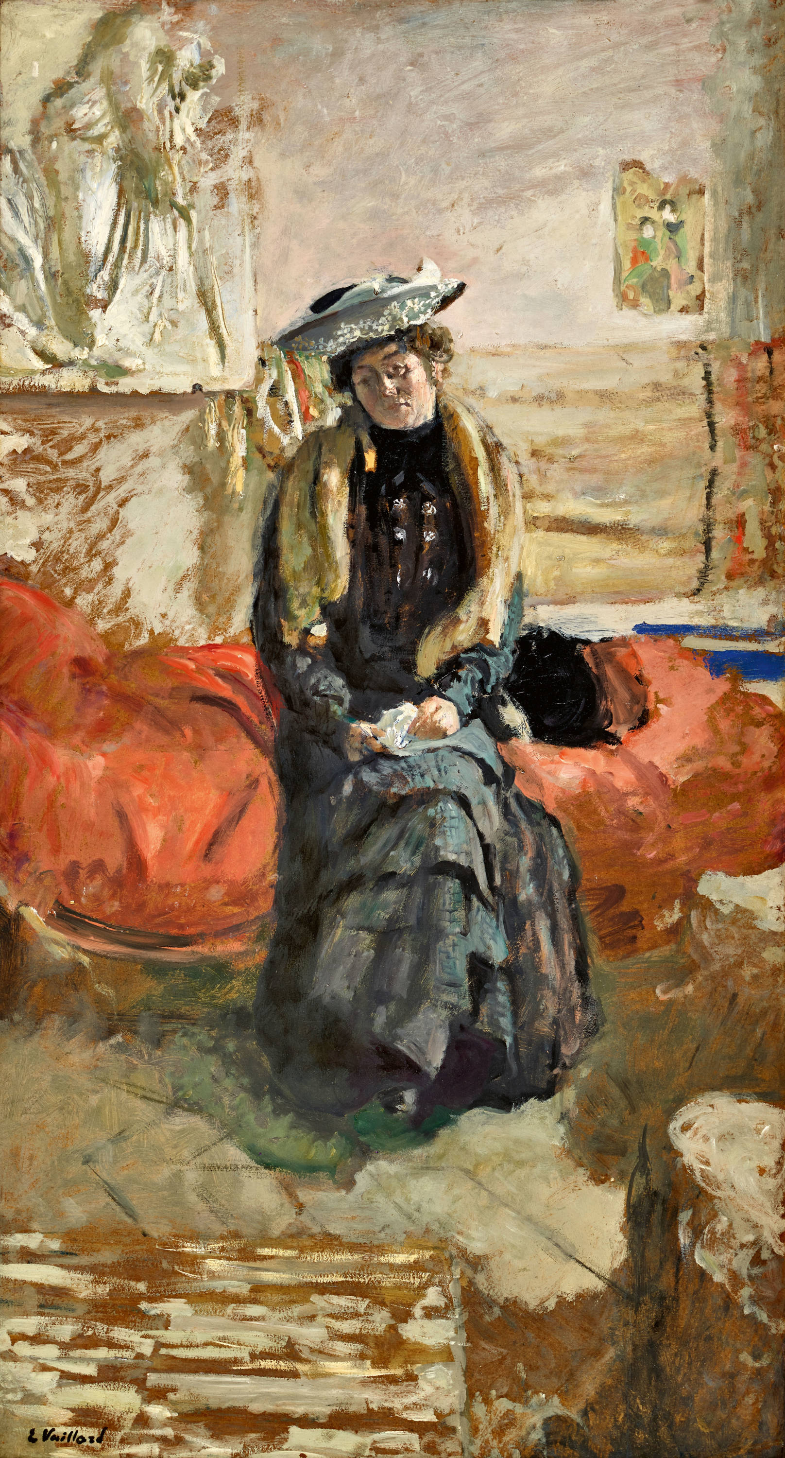 The neatly dressed lady is sitting on a red upholstered furniture, in her hands a handkerchief, her gaze lowered as if she were lost in thought. Édouard Vuillard's intimate interior scene testifies to the artist's quality in portrait painting. He was able to capture the sitter's emotional life in a subtle way, concentrating on her expression and pose, while the spatial surroundings seem to dissolve into loose brushstrokes, yet the room as a whole still remains recognizable as such. The work, which belongs to Intimism, reflects thematically as well as stylistically the spirit of the time around the turn of the century. Its Post-Impressionist manner together with the flatness of the pictorial space reveals references to the Nabis and the Japanese ukiyo-e prints, which influenced Vuillard's style. There is also a homage to the Japanism trend of the time in the form of a small painting in the background on the right wall which may be a Japanese woodcut