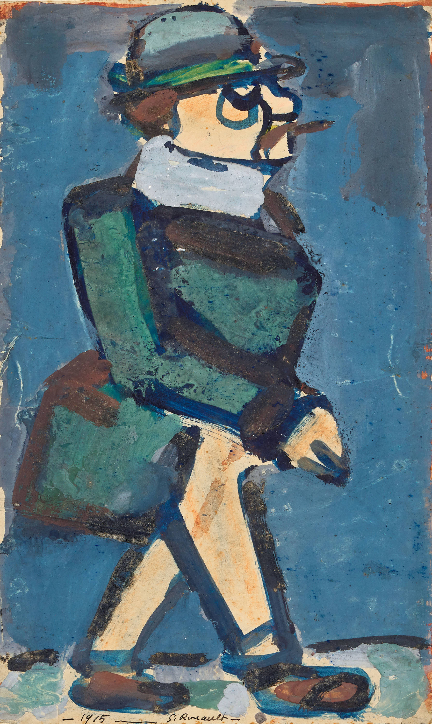 Zwischen 1910 und 1919 beschäftigte sich Georges Rouault mit einer Reihe von Grotesken und satirischen figürlichen Darstellungen, darunter auch "Bath le Fils ... II dit aussi "L'homme au cigare". Mit der steifen Haltung der männlichen Figur zielte der Künstler im vorliegenden Fall auf den Charakter des modernen Gentlemans.