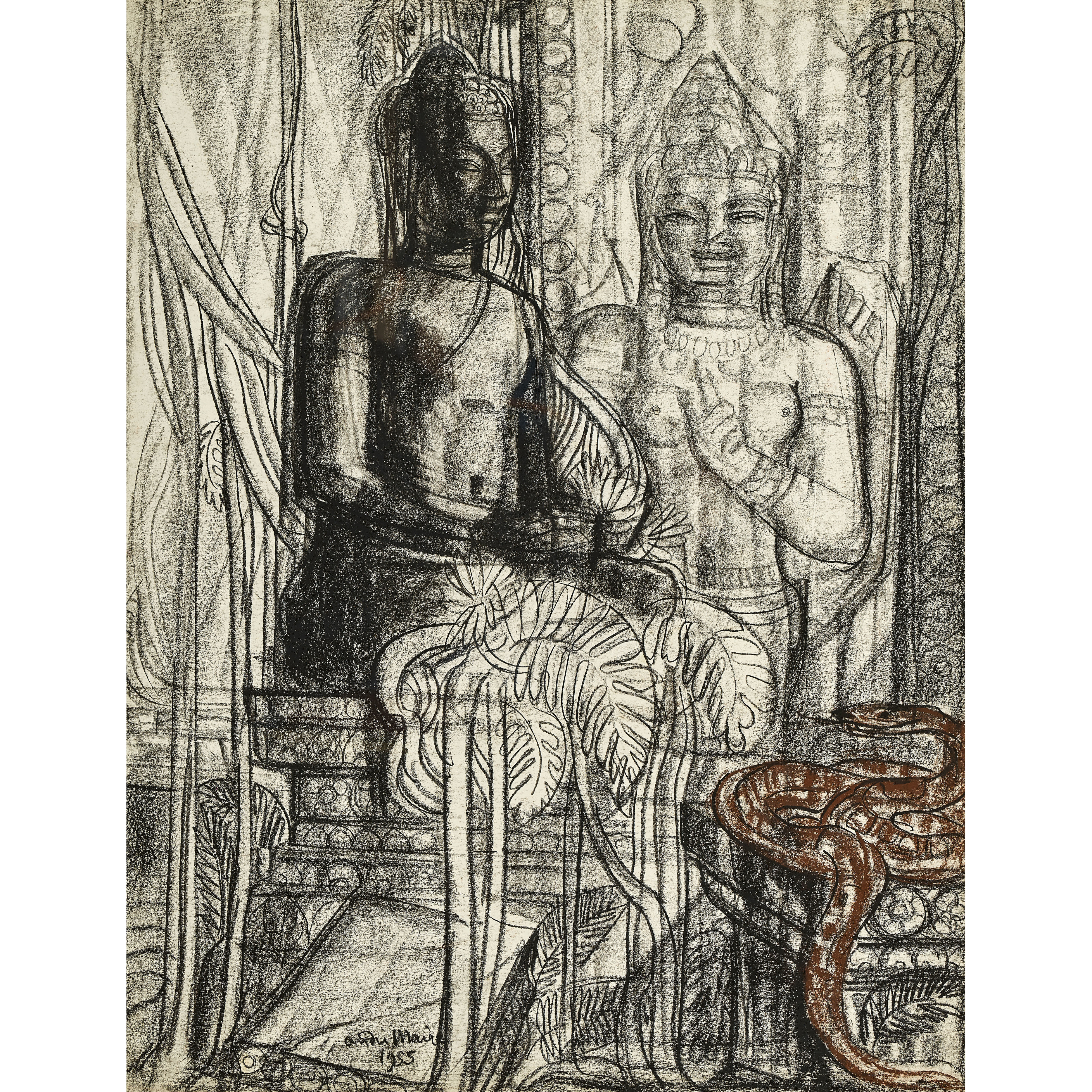 Interieur mit südostasiatischen Skulpturen und Schlange.