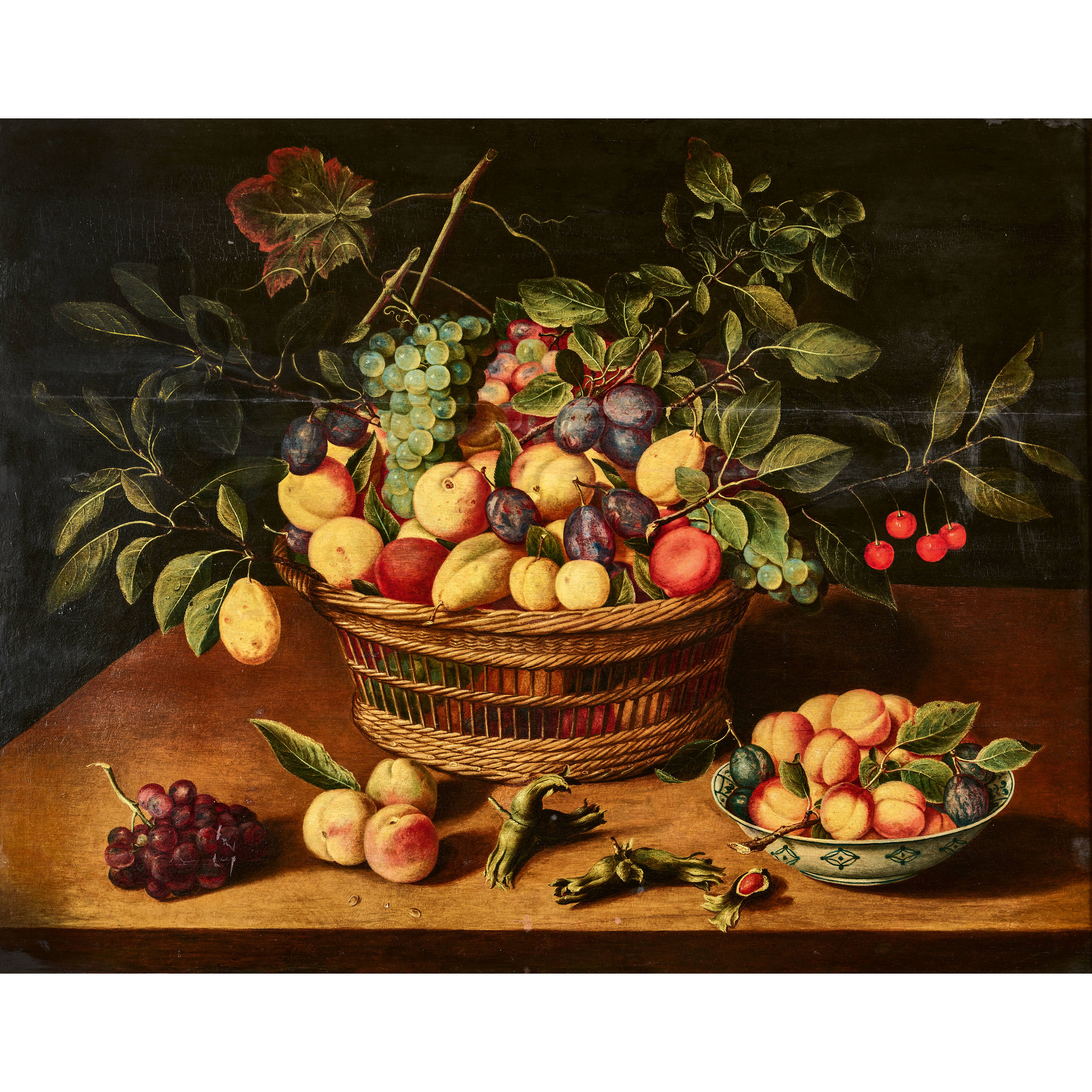 Auch im angebotenen Gemälde lassen sich viele klassische Elemente von Hulsdoncks Stilllebenmalerei erkennen. Die asiatische oder asiatisch inspirierte Keramikschale steht in direkter Nachbarschaft mit dem traditionellen einheimischen Flechtkorb. Mit Pfirsichen, Trauben, Pflaumen, Birnen, Aprikosen, Kirschen und Haselnüssen präsentierte Hulsdonck zudem eine breite Auswahl an Lebensmitteln, die denWohlstand Flanderns in jener Zeit zum Ausdruck bringen sollte.