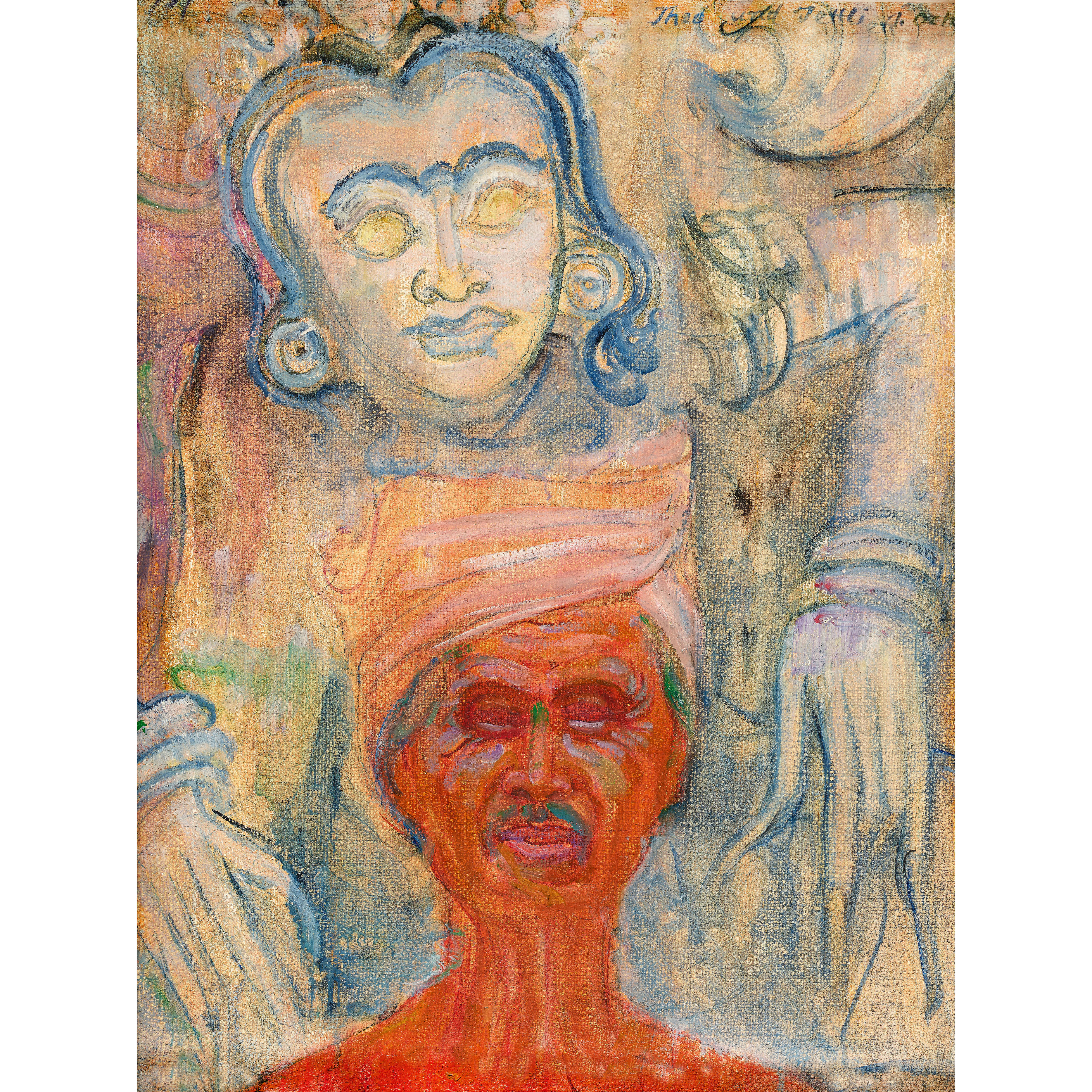 Die vorliegende Arbeit stammt aus Theo Meiers Zeit in Indonesien, wie an der Kopfbedeckung des Abgebildeten Mangku Dalam aus Tankop zu erkennen ist. Sie spiegelt die Auseinandersetzung des Künstlers mit fernöstlichen Kulturen und ihren Religionen wider.
