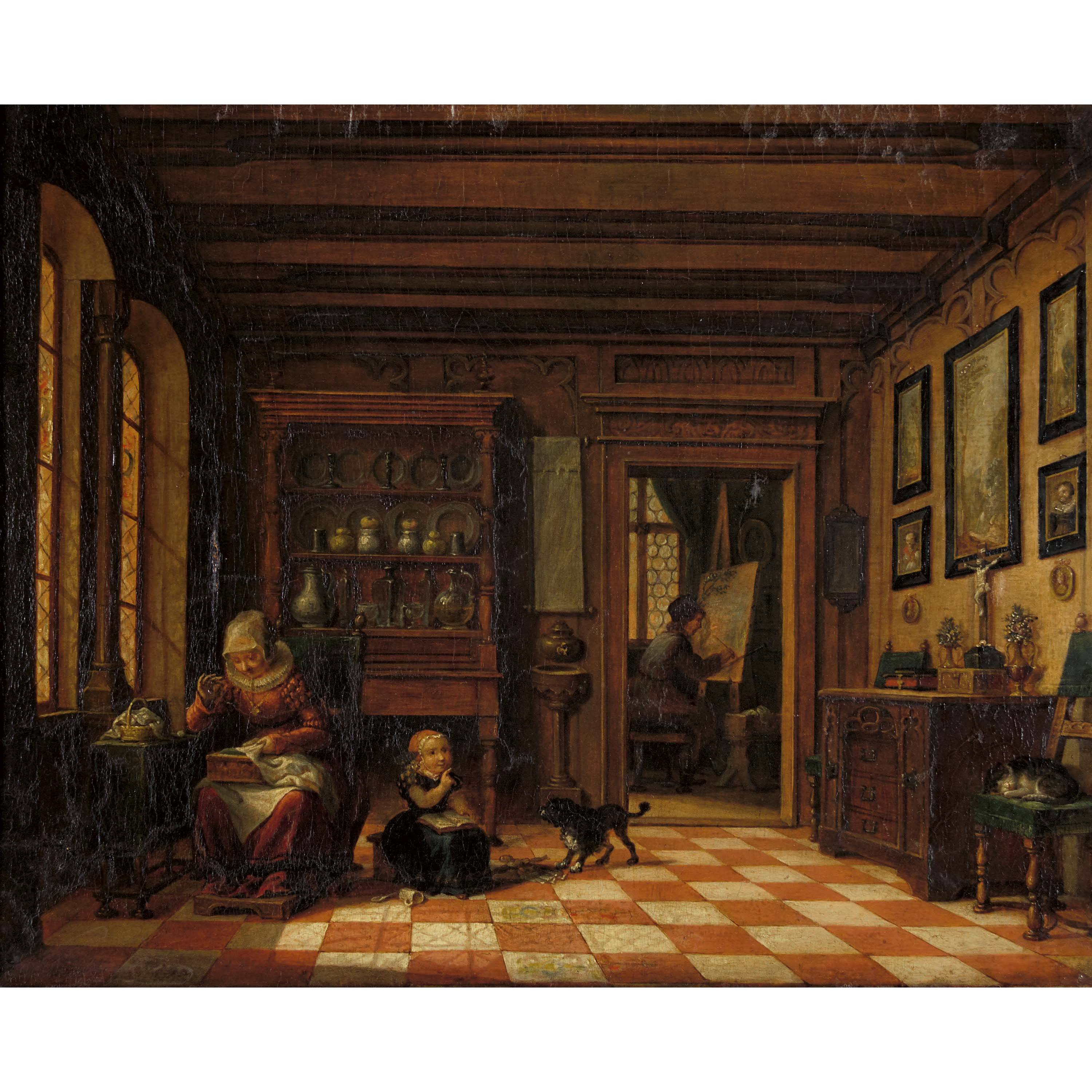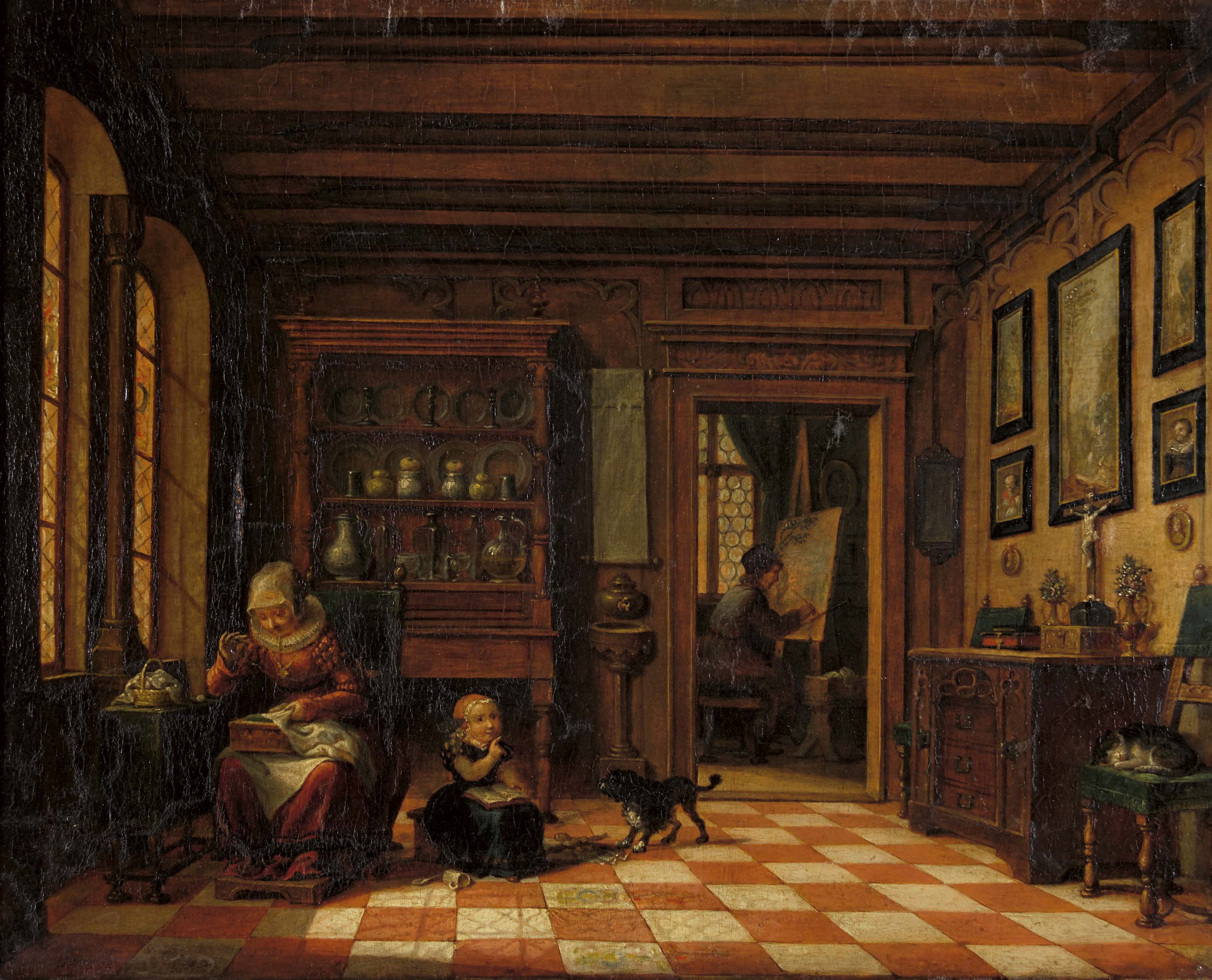 Interieur mit einer Frau bei der Stickarbeit und Maler an ..