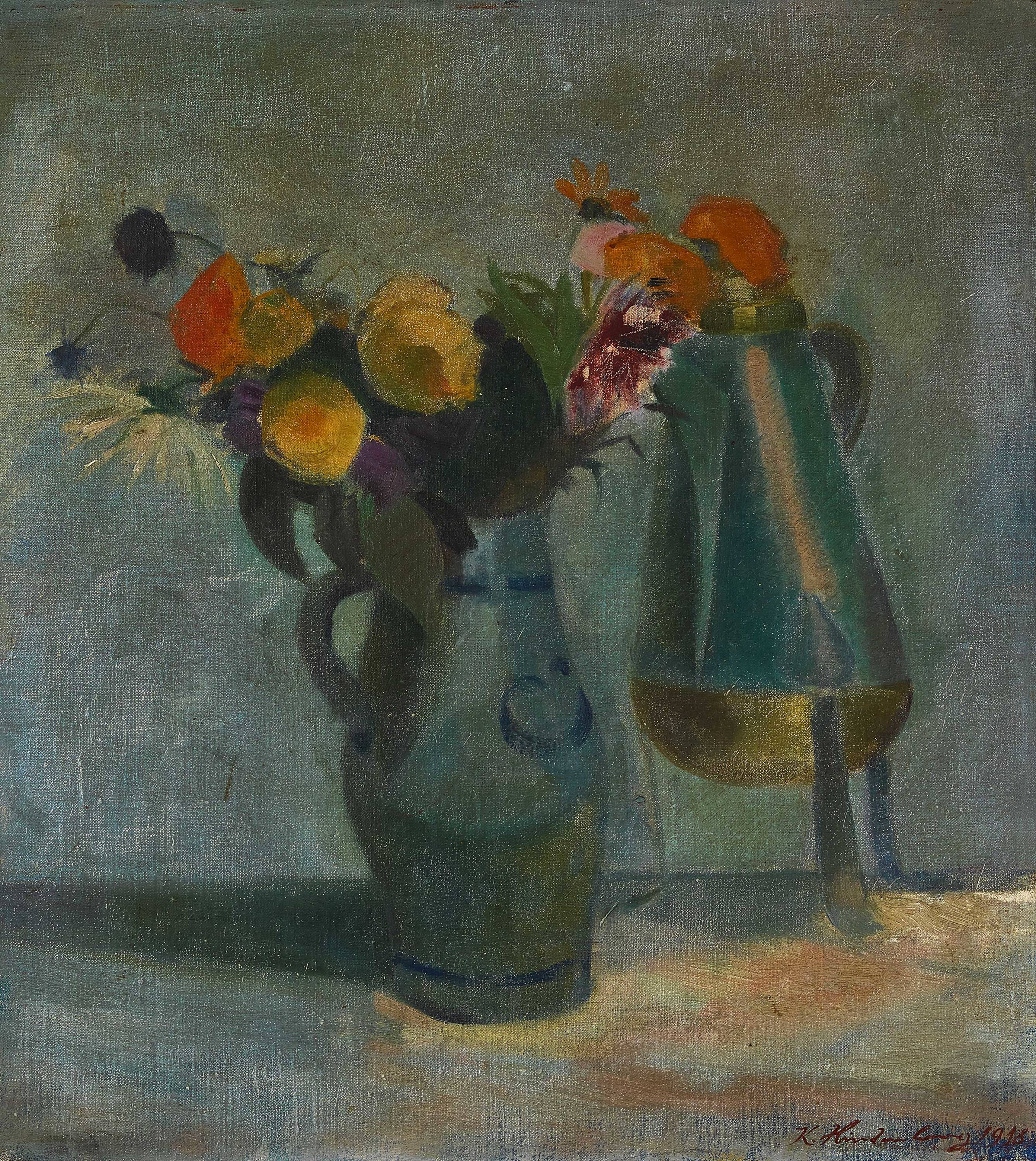 Stillleben mit Blumen, Steinzeugkrug und Ankerkanne.