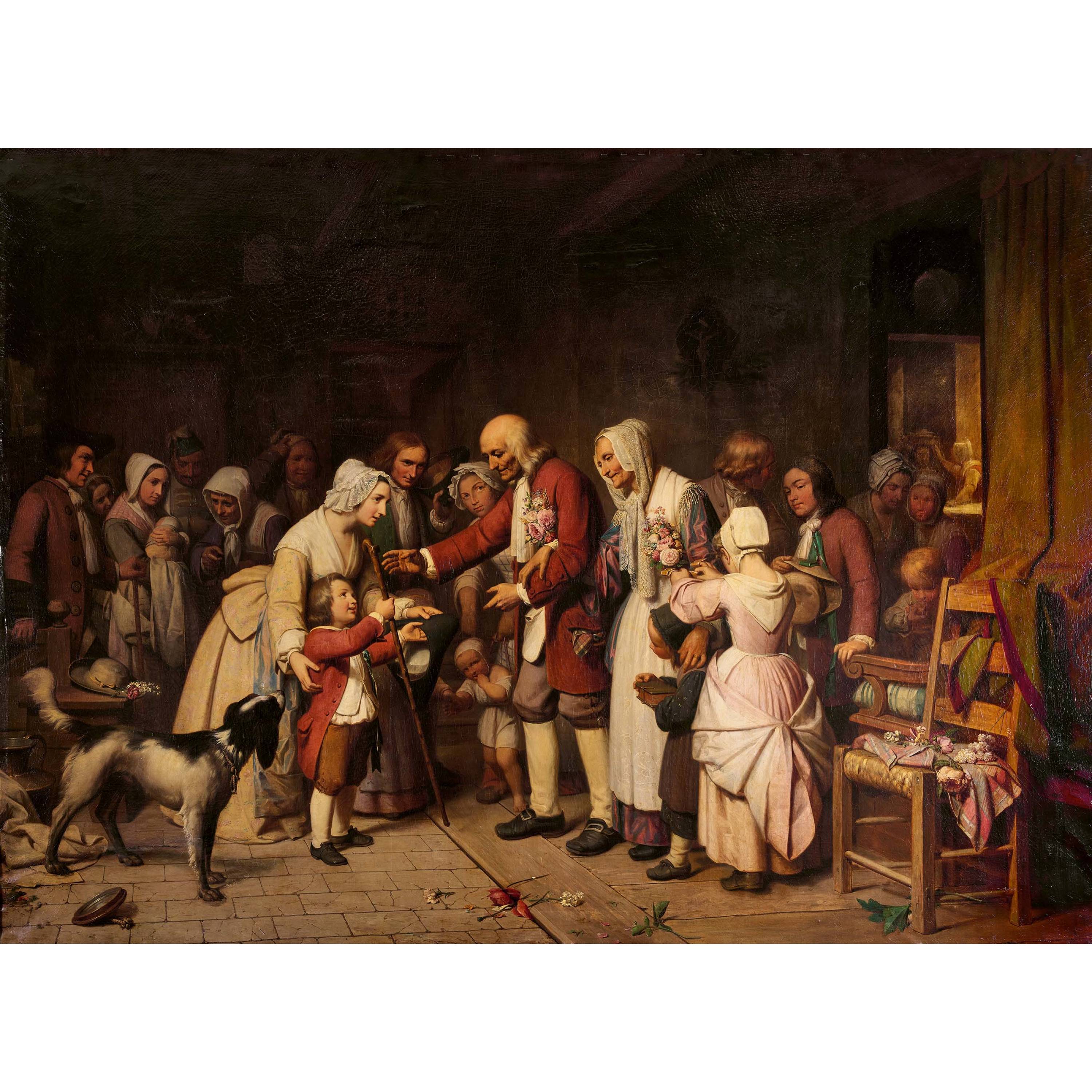 Beim angebotenen, grossformatigen Gemälde, das sich dem eher selten dargestellten Motiv der Goldenen Hochzeit annimmt, handelt es sich wohl um das Werk eines nicht identifizierten Künstlers der Düsseldorfer Schule, vermutlich aus dem Umkreis von Hubert Salentin. Die Düsseldorfer Schule ist bekannt für ihre stimmungsvollen folkloristischen Genredarstellungen, basierend auf intensiver Beobachtung des regionalen Landlebens und Brauchtums. Die oft anekdotisch aufgeladenen Bilder präsentieren meist vielfigurige und detailreich geschilderte Szenerien, wobei die Künstler der Düsseldorfer Schule besonderen Wert auf eine präzise Wiedergabe von Kleidung und Mimik legten.