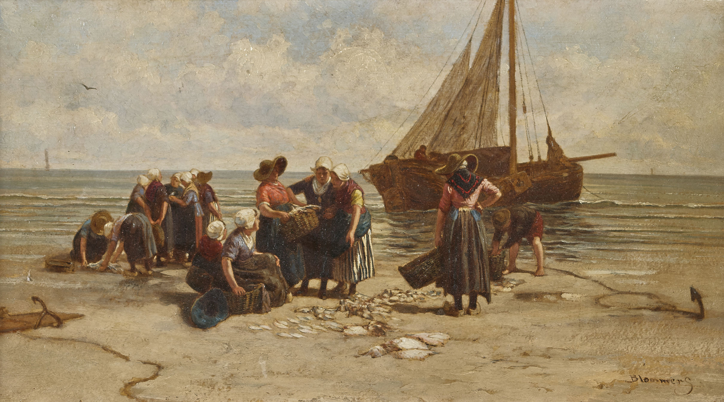 Beim angebotenen Werk handelt es sich um eine Kopie von Bernardus Johannes Blommers Gemälde "The catch Scheveningen", das sich heute in der Sammlung des Rijksdienst voor het Cultureel Erfgoed befindet. 1883 wurde es an der Weltausstellung in Amsterdam gezeigt und von Kritikern und Publikum mit grosser Begeisterung aufgenommen.