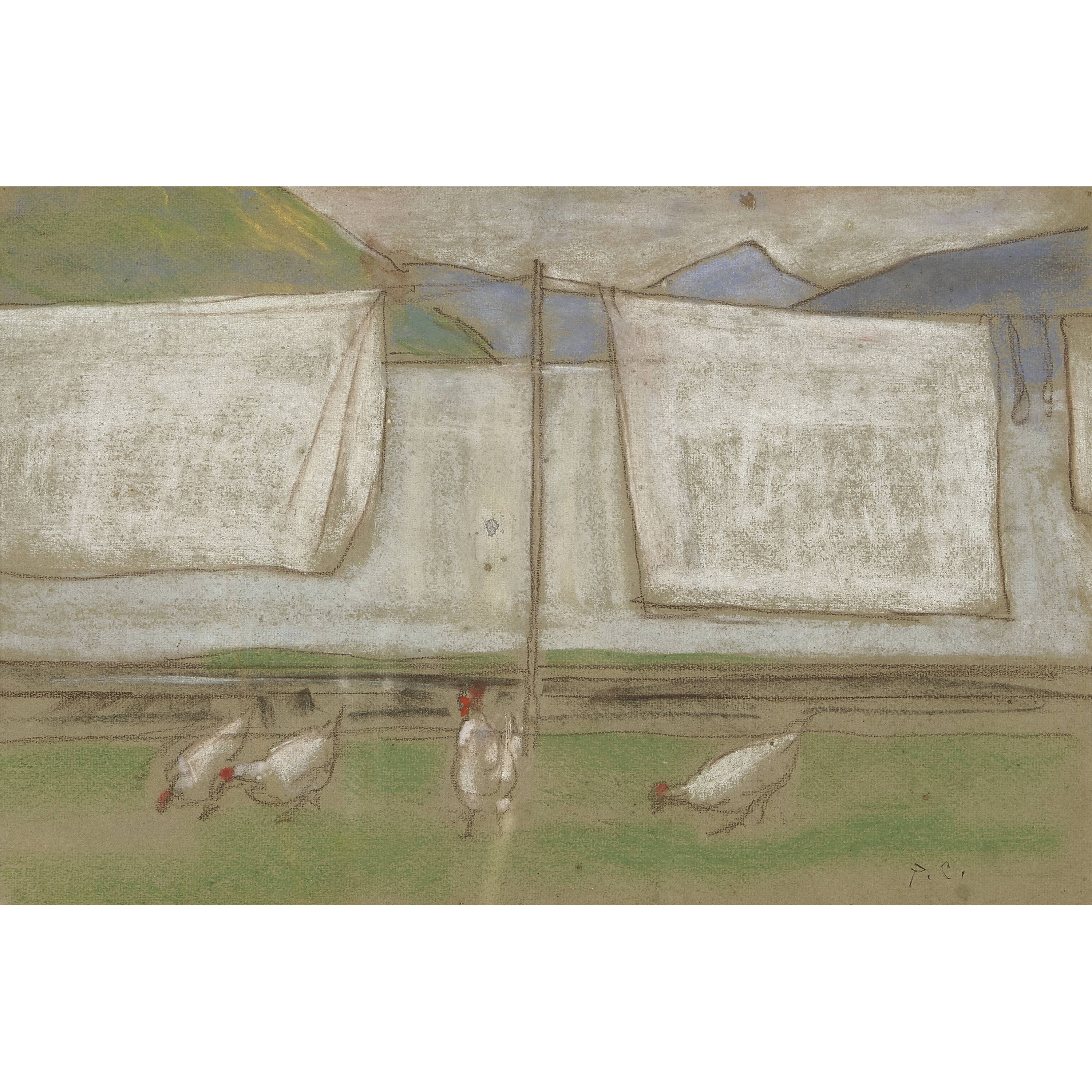 Wäsche an Wäscheleine und pickende Hühner.