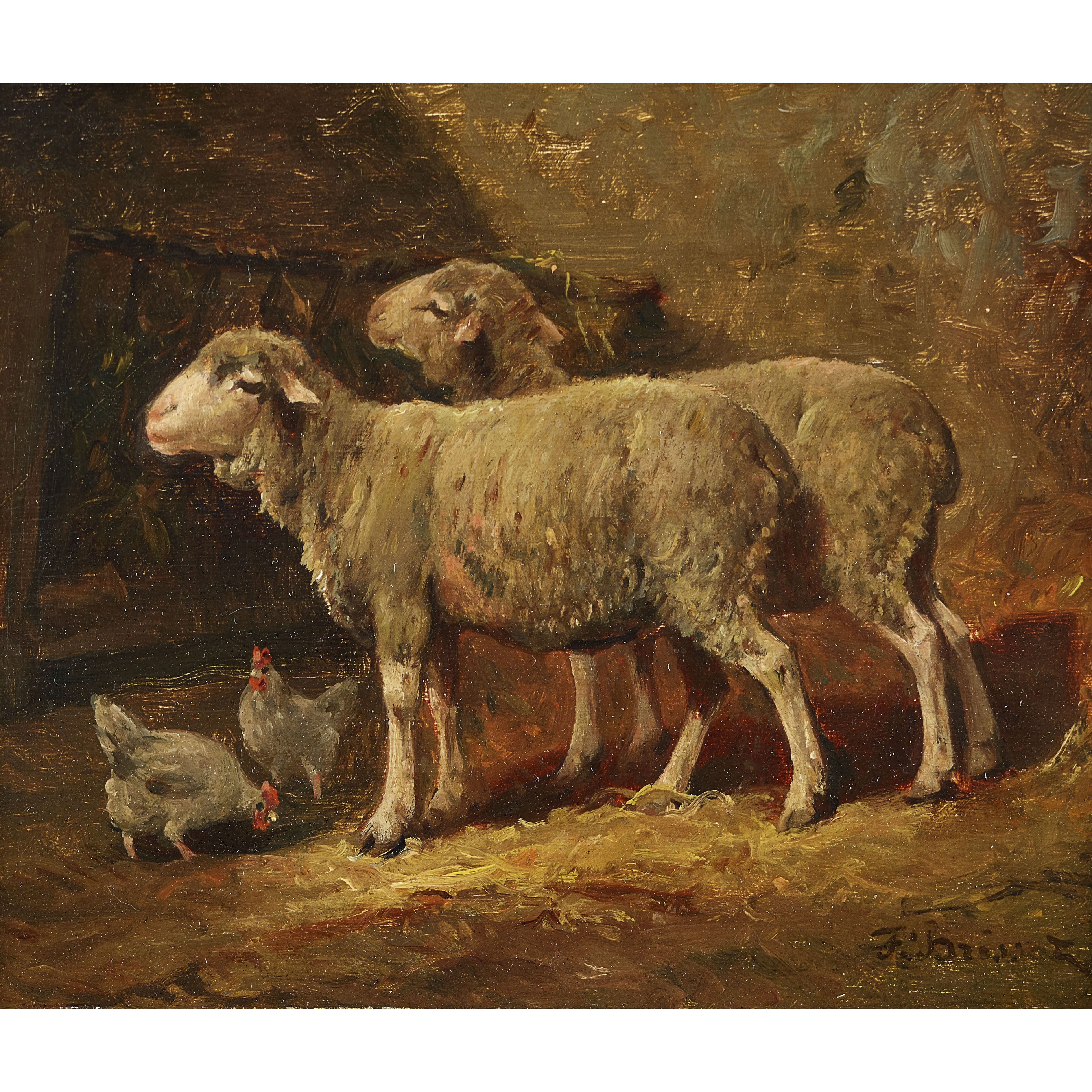 Schafe und Hühner im Stall.