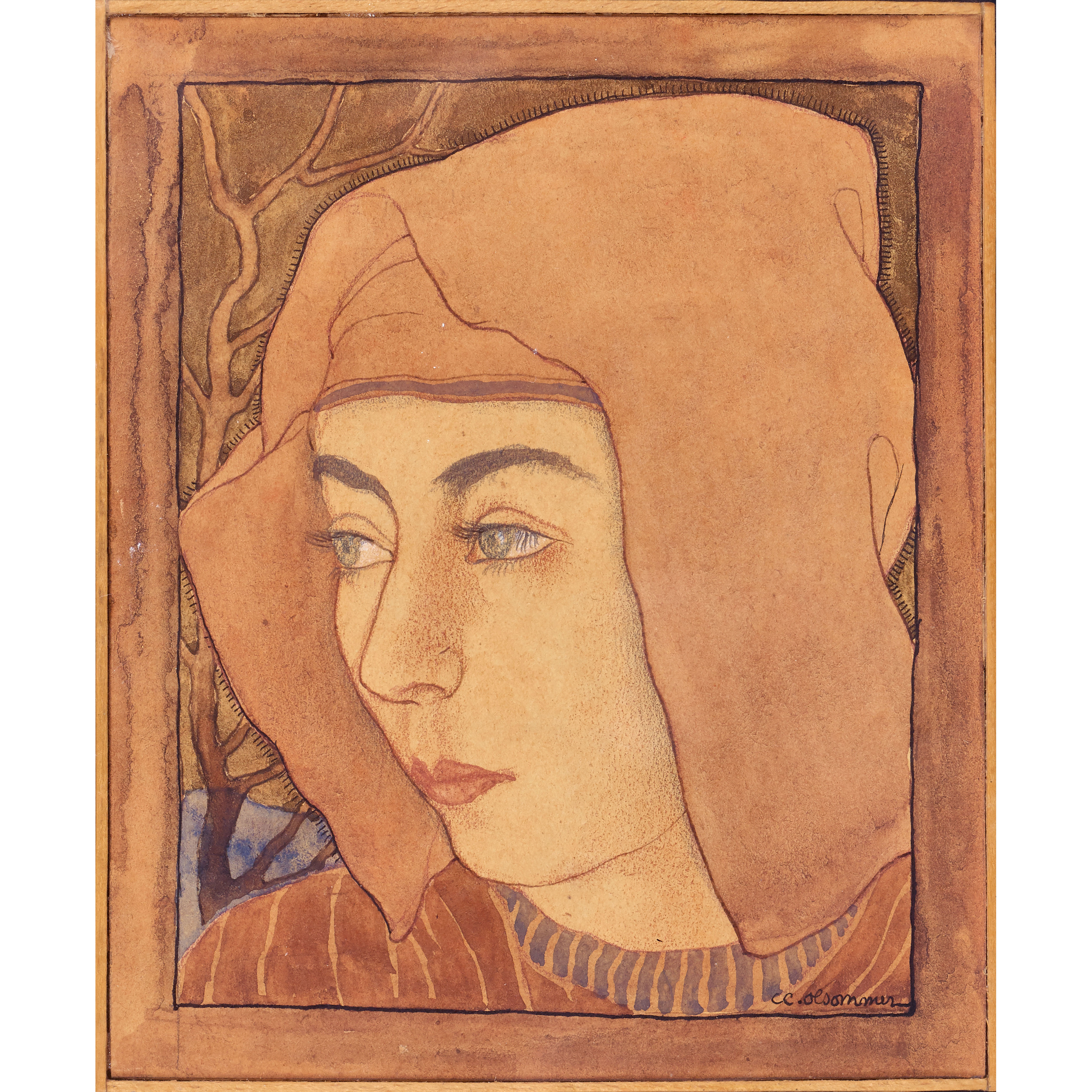 Bildnis einer jungen Frau mit Kopfbedeckung.