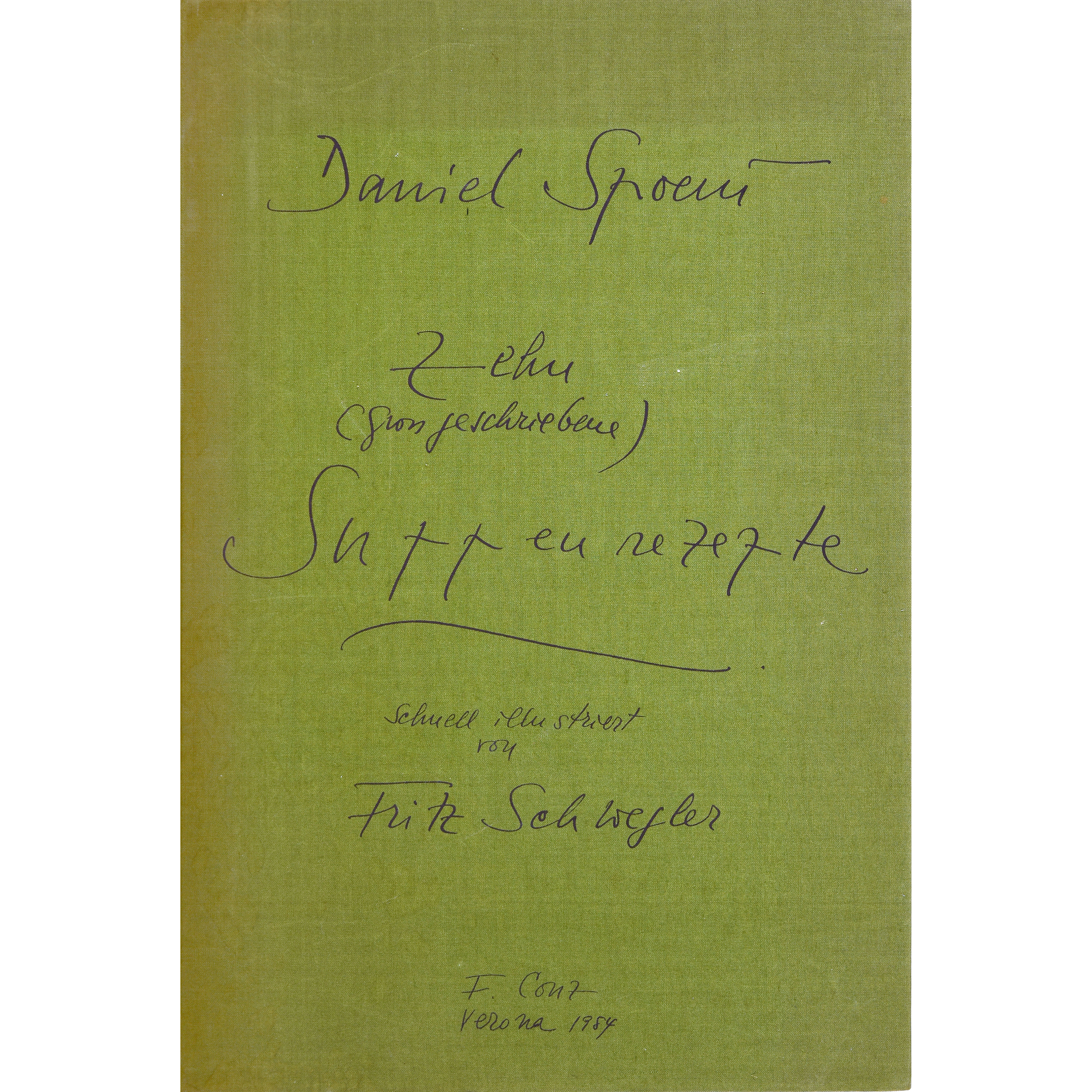 Franzesco Conz, Verona 1984. Num. Künstlerexemplar IV/XVI (Gesamtauflage 91 Exemplare). Mit 10 faksimilierten Suppenrezepten von Daniel Spoerri und aquarellierten Illustrationen von Fritz Schwegler auf chamoisefarbenen losen Doppelbogen, je von beiden Künstlern handsig. u. num., je ca. 45x62 cm. Druckvermerk von beiden Künstlern handsig. Grüne Leinenkassette mit gedrucktem Rücken- und Deckeltitel, Gr.-Folio
