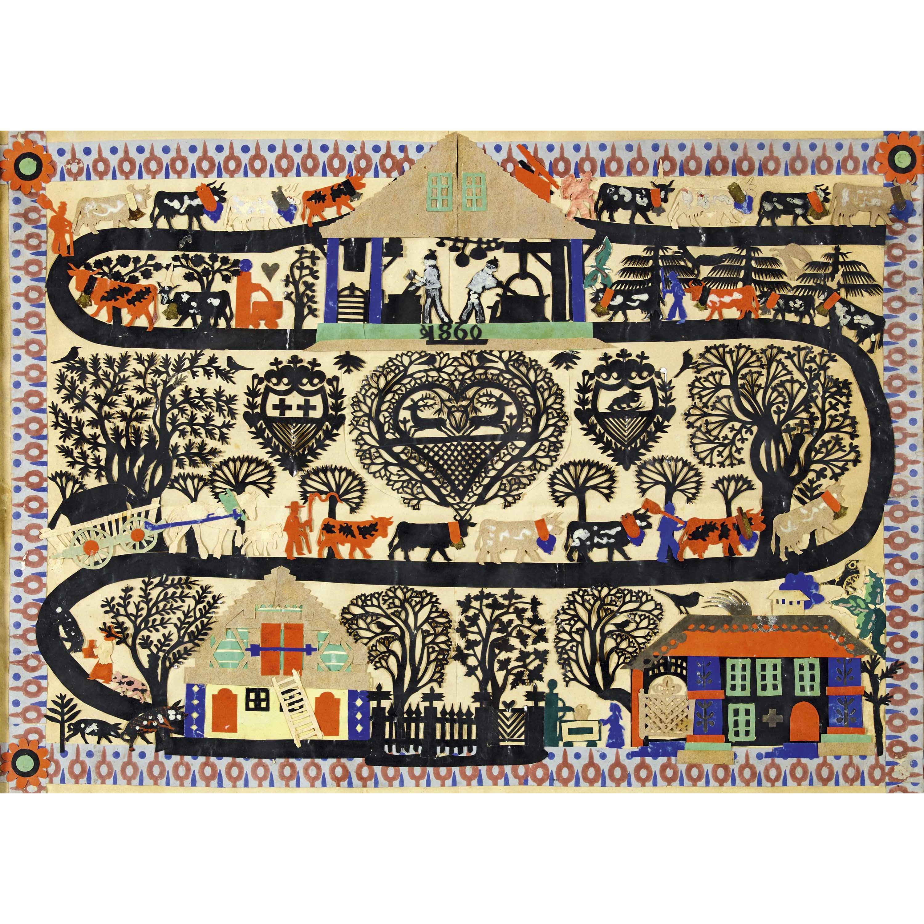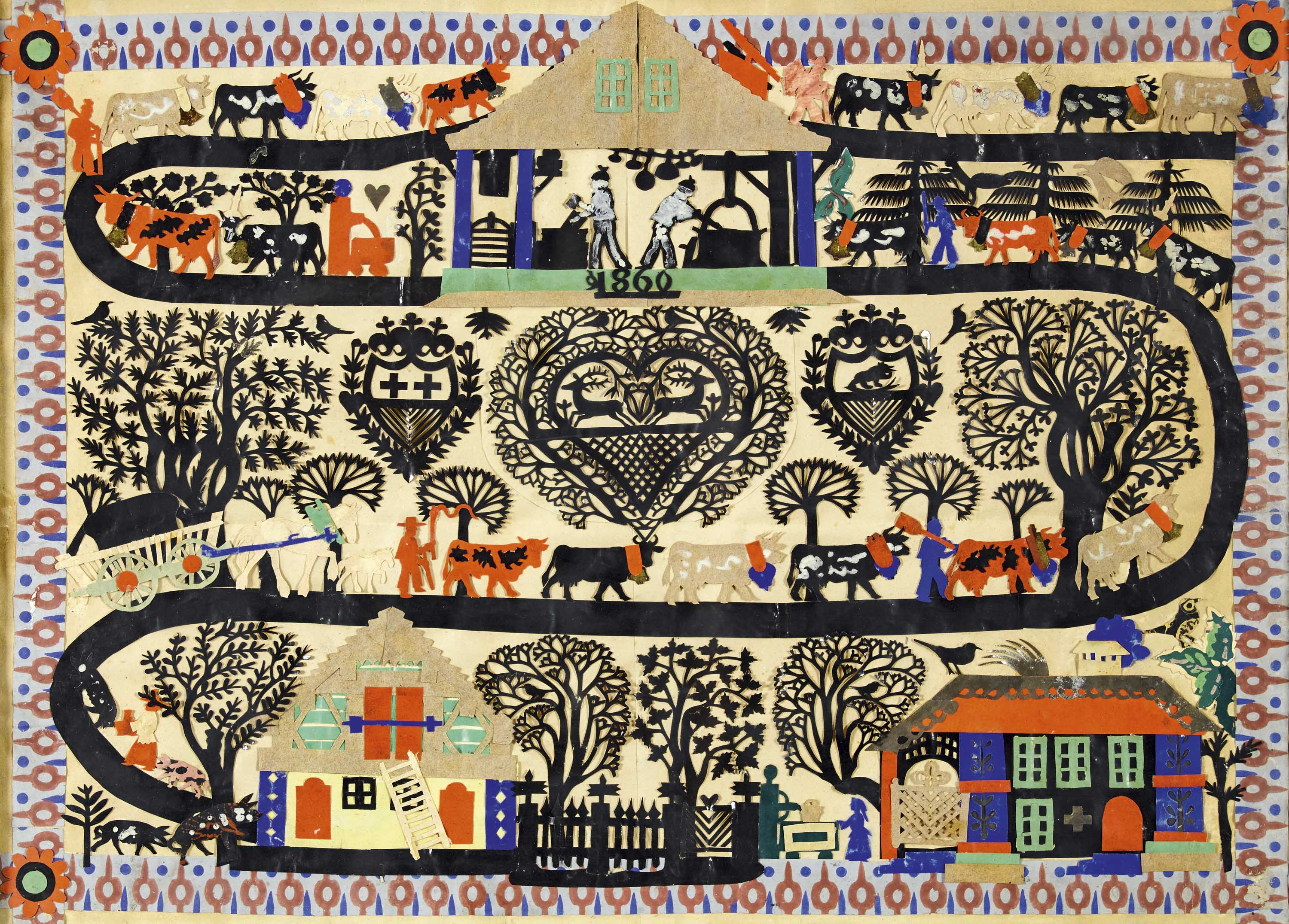 Hauswirths Arbeiten reichen vom schwarz-weissen Faltschnitt zum bunten Falt- und Klebeschnitt. Sein erster bekannter farbiger Scherenschnitt stammt aus dem Jahr 1847. Viele seiner Werke sind datiert, so auch der vorliegende farbige Scherenschnitt, der das Datum 1860 trägt und somit aus Hauswirths reichster Schaffensperiode zwischen 1850 und 1870 stammt. Zu sehen ist sein vielverwendetes traditionelles Sujet des Alpaufzugs, welches häufig demselben Bildaufbau folgt: Ausgehend vom stattlichen Bauernhaus am unteren Bildrand windet sich der Alpaufzug mit Kühen hinauf zur Alphütte, getrieben von einem Sennen mit Geissel und begleitet von einem Pferd, das den Leiterwagen mit den Gerätschaften für die Milchwirtschaft zieht. Am oberen Bildrand findet sich die Alphütte, die meistens mit Utensilien für die Käseherstellung ausgestattet ist. Auch hier, wie in fast allen von Hauswirths Arbeiten, findet sich in der Bildmitte ein Herz als Ornament, welches stets reich verziert und ausgestaltet ist.