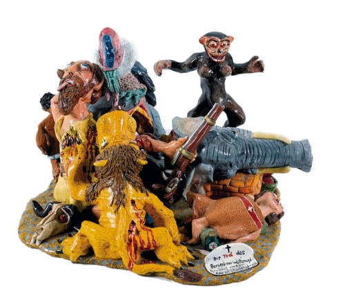 Bronze, polychrom gefasst, a.d. Grabplatte sig., dat. 1990, betitelt u. bez. "erzählt von Bärni Luginbühl", ca. H: 25 cm, B: 37 cm, T: 37 cm