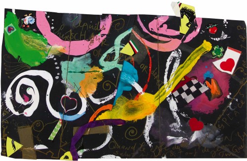 Gouache, Filzstift und Materialcollage auf zusammengefügten Blättern, sig. u.r., dat. 1. Juillet 1990, 26x44 cm