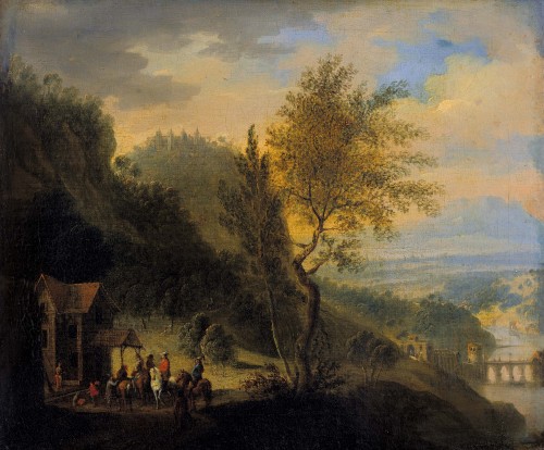 Rheinlandschaft mit rastenden Reitern und Brücke.