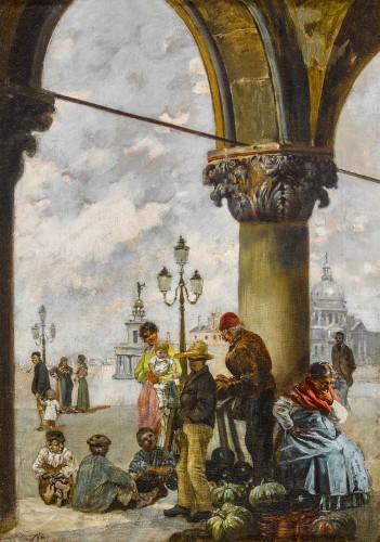 Gemüseverkäufer unter den Arkaden der Piazzetta in Venedig.
