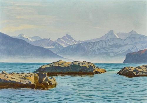 Thunersee bei Spiez mit Schreckhorn, Eiger und Mönch.