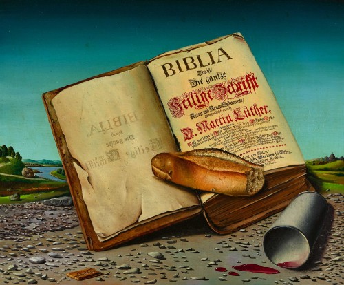 Stillleben mit Heiliger Schrift, Brot und Weinbecher.
