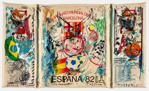 Mischtechnik und Collage auf aufklappbarem Sitzkissen der Fussball-Weltmeisterschaft 1982 in Spanien, sig. u.M., dat. 1982 u.r. sowie betitelt o.M., 36x60 cm (BM)