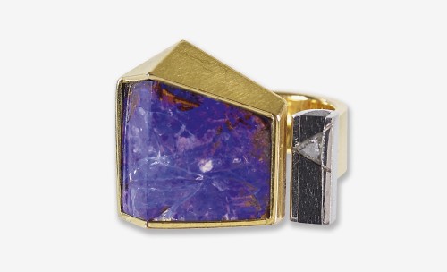 Extravagantes Bicolor-Modell aus Gelbgold 18 kt. und Palladium 750. Als Blickfang 1 grosser, asymmetrischer Opal, begleitet von 1 Ebenholz-Element mit 1 eingelassenen Diamant-Triangel von ca. 0,17 ct. (F/G, VS). An breiter Ringschiene. Gr. 57, 22,23 g