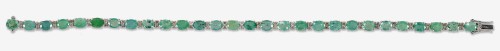 Klassisch-elegantes Modell aus Weissgold 18 kt. Das bewegliche Band alternierend gefasst mit 28 ovalen, facettierten Smaragden von zus. ca. 7,50 ct. und 28 Brillant-Paaren von zus. ca. 0,50 ct. An integriertem Kastenschloss mit doppelter Achtersicherung. L: ca. 19,0 cm, ca. 9,4 g