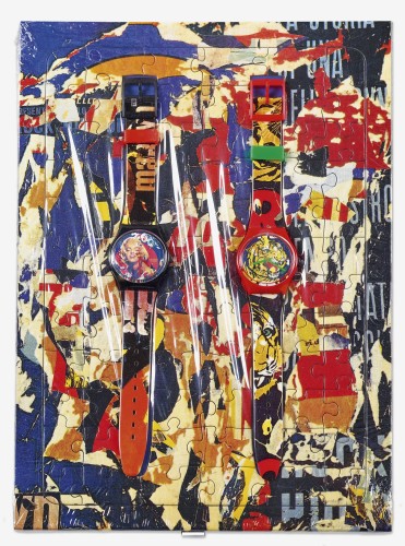 Limitiertes Set im Pop Art-Stil, bestehend aus 2 wasserdichten Armbanduhren mit Zentralsekunde nach Entwurf des italienischen Künstlers Mimmo Rontella. Modell "Marylin" im Vintage-Décollage-Stil mit Ikone Marylin Monroe. Modell "Bengala" mit fauchendem Tigermotiv. Armbanduhren zusammen mit Puzzle in verschweisster Originalverpackung.