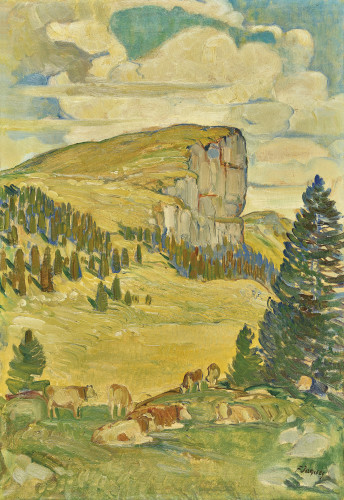 Juralandschaft mit weidenden Kühen.