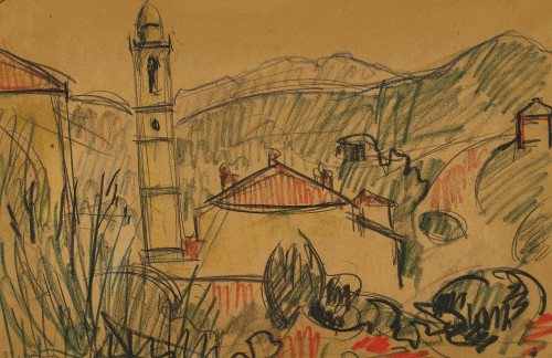 Tessiner Landschaft mit Kirchturm.