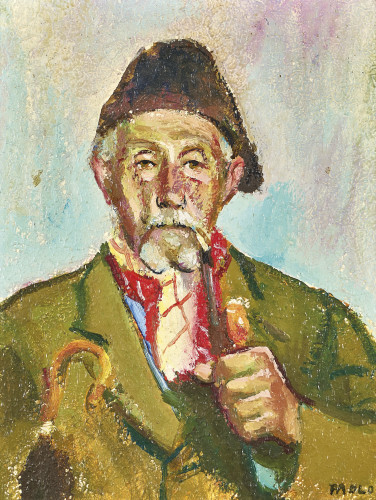 Porträt eines alten, Pfeife rauchenden Herrn im Anzug.