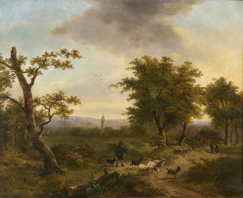 Landschaftsidylle mit Schafen, Ziegen, Hirt und Kirche.