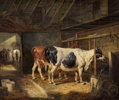 Kühe und Pferde im Stall.