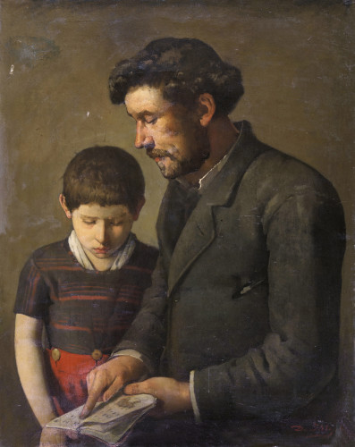 Öl auf Leinwand, doubliert, sig. u. dat. (18)85 u.r., verso a. Keilrahmen betitelt u. bez. "Mon frère et son fils Robert", 90x71 cm