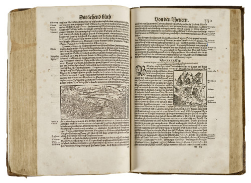 Christoph Froschauer, Zürich 1548. Erste Ausgabe. Die Bücher 5-13 in 1 Bd. Mit zahlreichen Textholzschnitten, u.a. von Hans Asper, Johann Wyssenbach und Heinrich Vogtherr d.Ä. sowie einer Vielzahl teils vom Verfasser selbst entworfener Holzschnittkarten. 467 Blätter. Ornamental geprägter Ledereinband über Holzdeckeln auf fünf Bünden, Folio