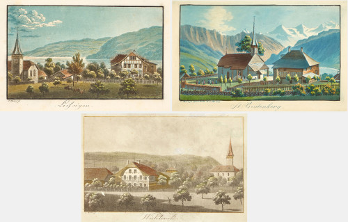 3 Blätter aus "Bernische Landpfarrhäuser": 1. Leissingen. 2. St. Beatenberg. 3. Wichtrach. Aquatinten, kol., je bez. "S. Weibel fc." u.l., je ca. 11,5x19 cm (PL), je gerahmt