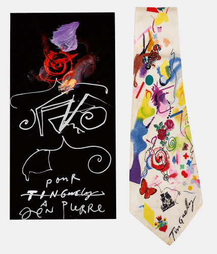 Seide, polychrom bedruckt mit einem Entwurf von Tinguely, gedruckte Künstler-Sig., a. Verpackung dat. u. num. 162/1000,