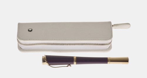 Modell "Princesse Grace". Sich verbreiternde Form aus violettem Edelharz mit vergoldeten Details, Rautengravur und Perlmutt-Cabochon. Abschraubbarer Deckel mit gravierter Mgr.-Spiegelung unter Krone und Montblanc-Emblem. Clip mit rosafarbenem, tropfenförmigem Topas. Feder aus Gelbgold 18 kt.