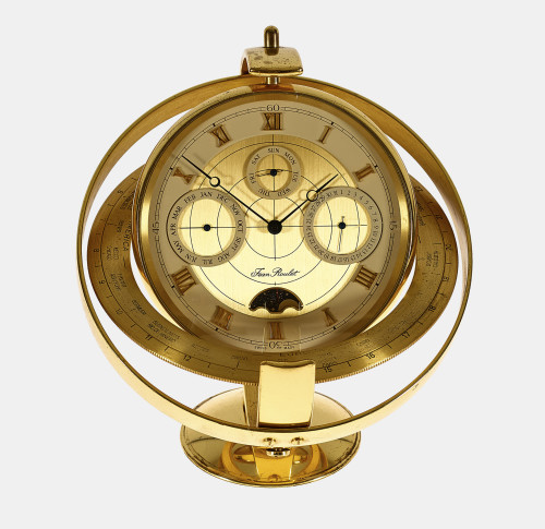 Verglastes Messinggehäuse in kardanischer Messinghalterung mit Weltzeitangabe. Zifferreif mit aufgesetzten römischen Ziffern und arabischer 15-Minuten-Einteilung, stahlgebläute Breguetzeiger. Wochentag- und Datumsanzeige. Batteriebetriebenes Quarzuhrwerk.