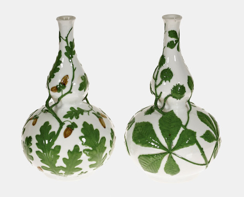 Je gedrückter Kugelkorpus mit abgesetztem Hals. Umlaufend plastischer Dekor aus Eichen- und Kastanienlaub mit Früchten.