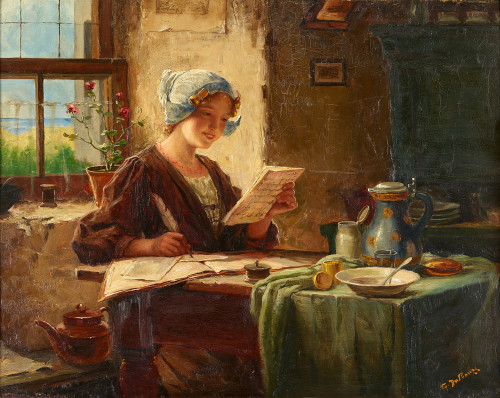 Interieur mit junger Frau beim Lesen und Schreiben.