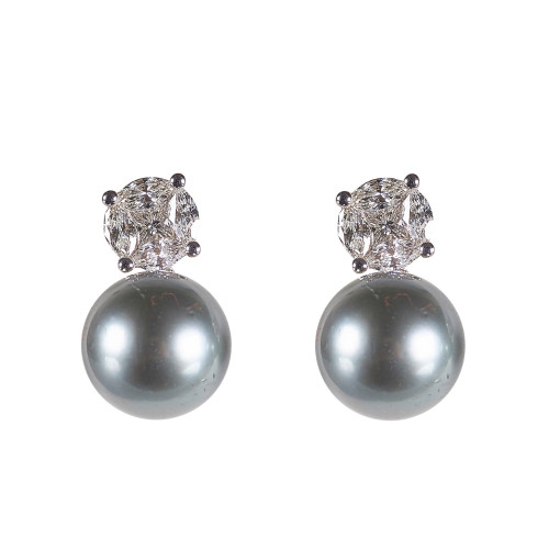Anmutiges Paar aus Weissgold 18 kt. Je 1 gräulich lüstrierende Tahiti-Zuchtperle von ø ca. 11,5 mm an einem Steckerteil, besetzt mit je 1 Diamanten von zus. ca. 0,31 ct. im Princess-Cut, eingefasst von je 4 Diamant-Marquisen von zus. ca. 0,84 ct. Je H: 2 cm, zus. ca. 7,4 g