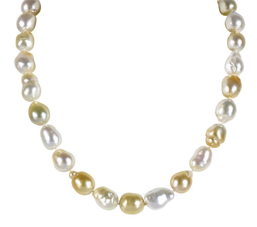 Ansprechendes, aus 29 barocken Südsee-Zuchtperlen in weissem und hellgelbem Farbton gebildetes Modell. An Magnetkugelschliesse aus Gelbgold 18 kt. L: 44 cm