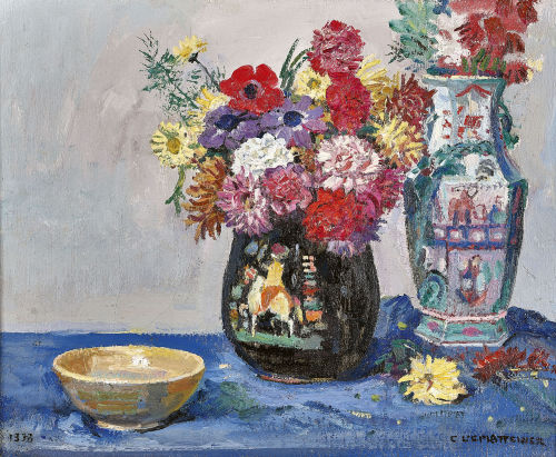 Tischstillleben mit Gefässen und Blumen.