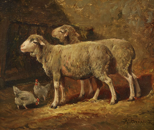 Schafe und Hühner im Stall.
