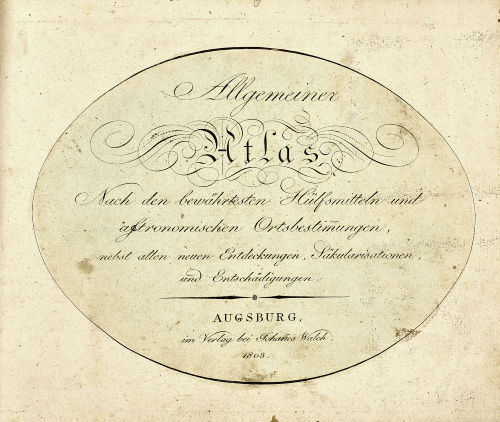 Johannes Walch, Augsburg 1803. Atlas mit den 32 im Register erwähnten kol. Kupferstichkarten und fünf zusätzlich eingebundenen Karten ("Boehmen, Mähren, Schlesien u. die Lausitz", "Der Oberrheinische u. Churrheinische Kreis", "Das Königreich Baiern", "Westphalen", "Holland und Berg"). Von Hand geschriebenes Register, Titelblatt, 38 S. Brauner Halbledereinband, appliziertes Besitzeretikett, 8ø