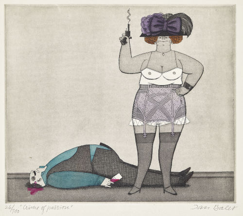 2 Blätter: 1. "Crime of passion". 2. "The fortune hunter". Farbaquatinta-Radierungen, je handsig. u.r., je num. 26/100, 23x27 cm bzw. 23,5x31,5 cm (PL)